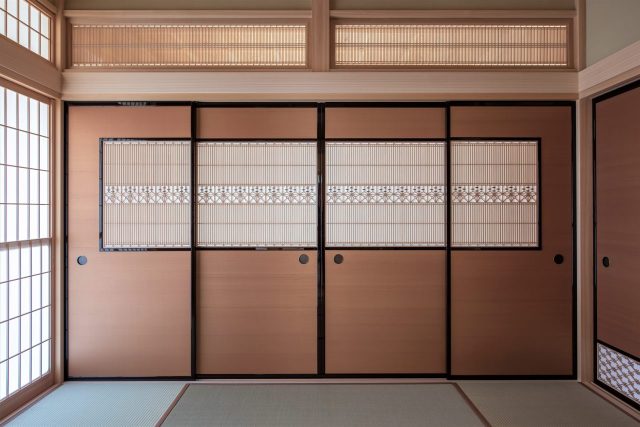 和室入口 モダンブラス格子襖(ブラスト鉄線)