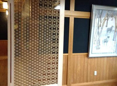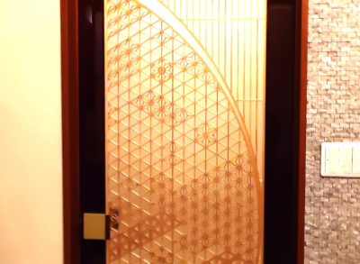 築10年の平屋建てこだわり和風住宅で冬場の寒さ防ぎたいとのことでモダン組子引き戸を提案納品しました。 枠材は木曾檜を組子は麻の葉と竜胆のコラボレーションです。 両面に3㎜透明のアクリルを挿入しました。大工工事をすることなく外付けHa...
