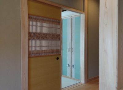 モダン和風住宅 モダン組子襖吉野杉白木造り・組子角麻の葉 帯 襖紙(高級和紙・紬セレクト)廊下玄関和室側 神棚下 両開き収納模様は源氏香図掘り込み【香道 模様】 中蓮窓・design障子 角麻の葉 襖とデザイを共通させました。伝...