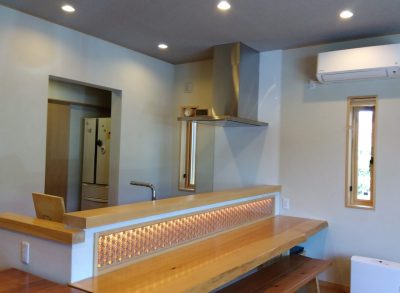 新築檜造りモダン和風住宅 Livingカウンター 組子工芸(麻の葉) LED照明伝統組子工芸麻の葉 モダン格子戸(食品庫) 無垢タモ材テーブルパントリー入口 モダンデザインフラッシュ戸(弊社オリジナルブラスト) modern引き戸モダン格子戸多種・多様...