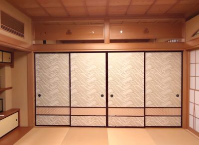 築10年 高級和洋折衷住宅建具のリフォーム潤み塗り 襖紙-こだわカわりの京唐紙(光琳大波) 伝統工芸和紙使用組子工芸(桔梗麻の葉)を中段に配してあります。引手にもこだわり おべや製京金物使用 光琳大波(桔梗麻の葉)組子工芸(桔梗麻の葉) 仕...